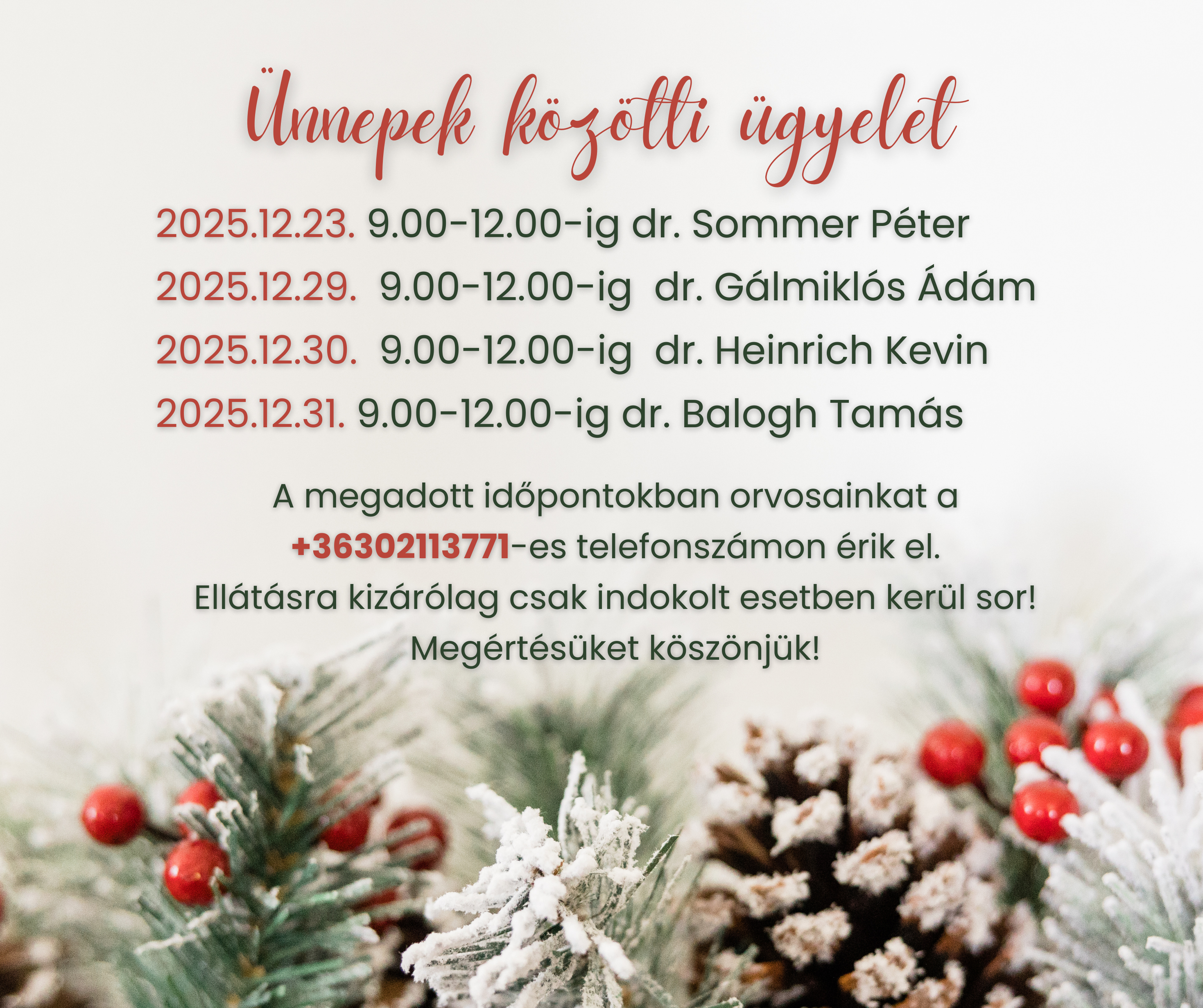 Az ünnepi időszakra tekintettel ellátásra csak indokolt esetben kerül sor.